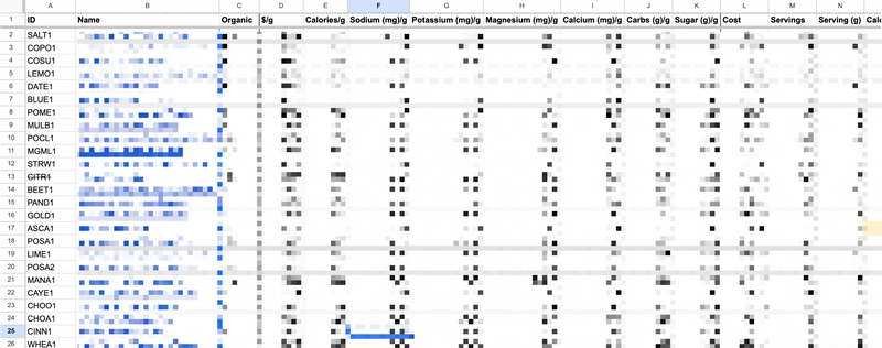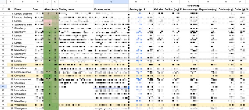 So: my wife and I have been making our own and testing different formulas. We’ve settled on a few that we think are really good (three flavors, each with a subjective rating of 8.5/10 or above from both of us). Here’s just a part of the tracking spreadsheet!