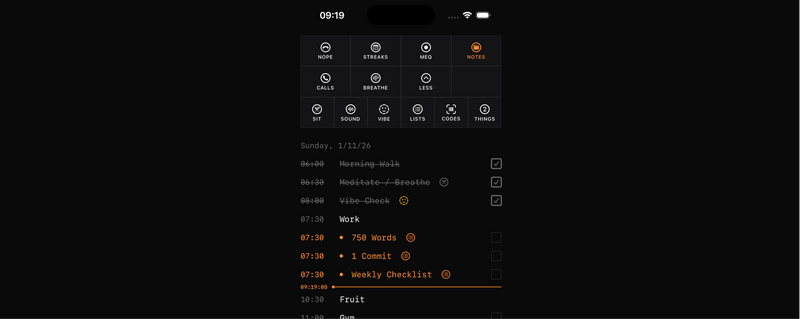 Below the module bar is the heart of the app: a timeblocked, templated schedule. Each day has a different schedule, including general timeblocks (“Work”) and reminders / tasks. You can see in that screenshot, for instance, completed Vibe Check and Meditation sessions (both linked to specific modules), as well as habits I still need to complete (750 Words, 1 Commit), and more.