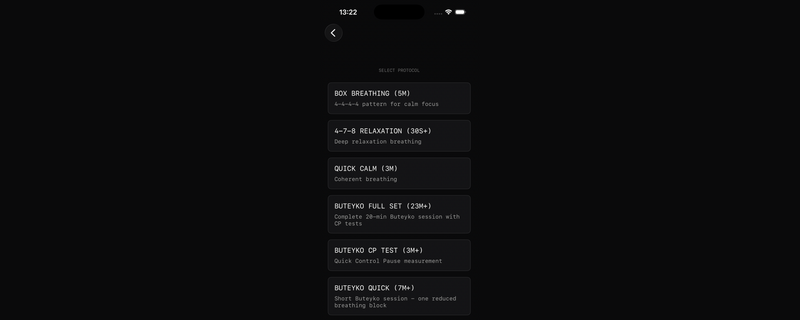 These routines guide you fully through the sequence with audio and visual cues (text, a pulsing circle). A few screenshots from a Buteyko sequence: