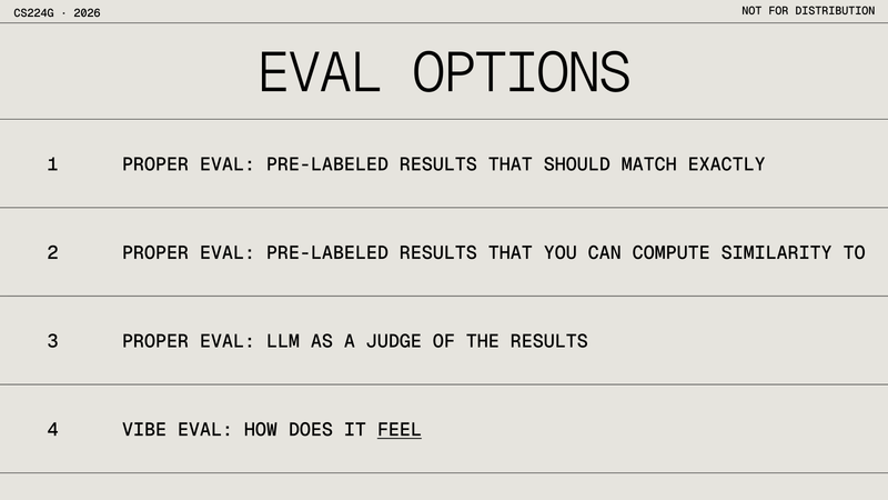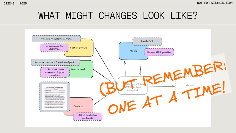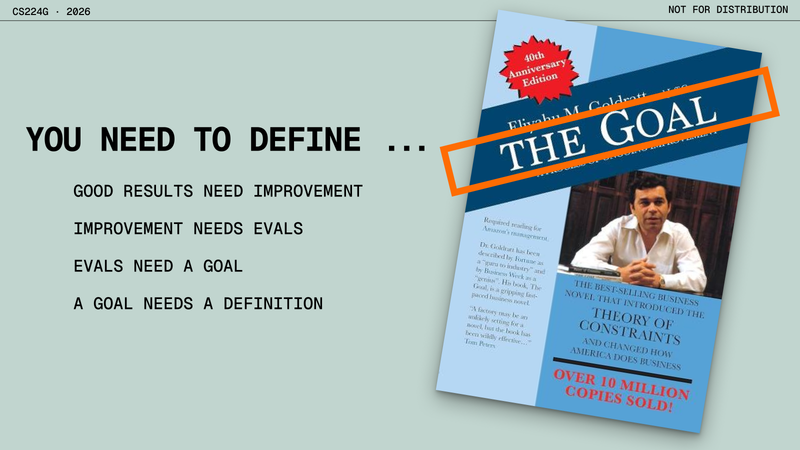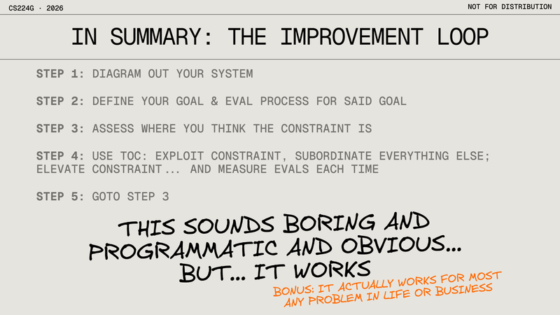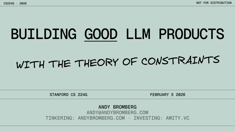 Earlier this month I gave a guest lecture at Stanford’s CS 224G course “Building & Scaling LLM Applications” on applying the Theory of Constraints to building LLM products. Thanks to instructors John Whaley and Jan Jannick for inviting me! Below are the slides from the talk with accompanying notes.