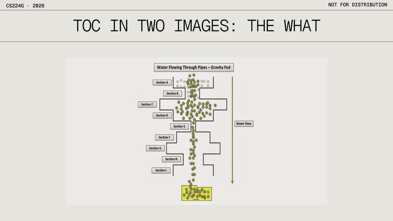 TOC in one image: The What. Think of a system as water flowing through a series of pipes. Each pipe section has a different diameter. The total throughput of the system is determined by the narrowest pipe – the bottleneck, or “constraint.” No matter how much you widen other sections, total flow doesn’t increase until you address the bottleneck.