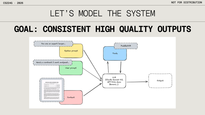 Here’s what that looks like concretely. Imagine you’re building a contract analysis tool: the system prompt says “You are an expert lawyer…”, the user prompt includes the analysis request, the context includes the actual contract document, and a tool like PaddleOCR handles document extraction.