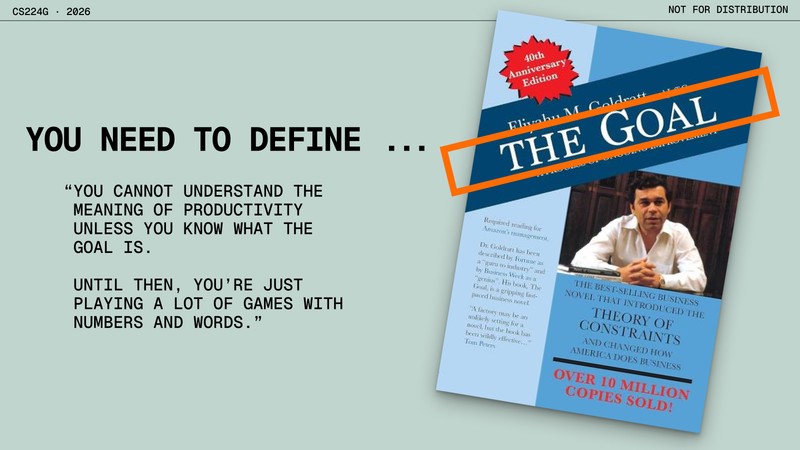 You need to define The Goal. As Goldratt puts it: “You cannot understand the meaning of productivity unless you know what the goal is. Until then, you’re just playing a lot of games with numbers and words.”