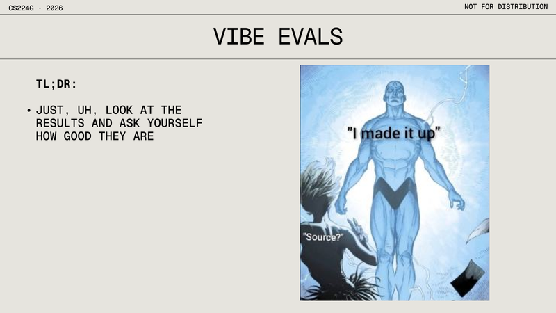 For vibe evals: sometimes your product’s outputs are too varied or subjective for structured scoring. In those cases, you just… look at the results and ask yourself how good they are. Not as good, but much easier.