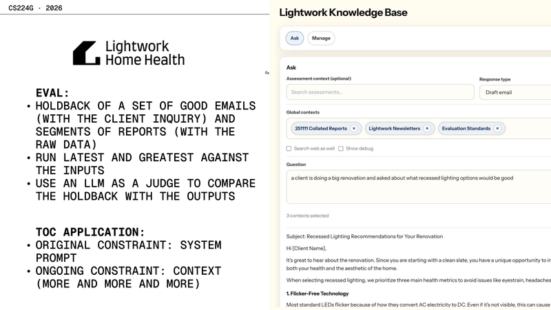 Lightwork Home Health built a knowledge base tool where our team can ask questions and get draft email responses or segments of reports grounded in prior research and reports.