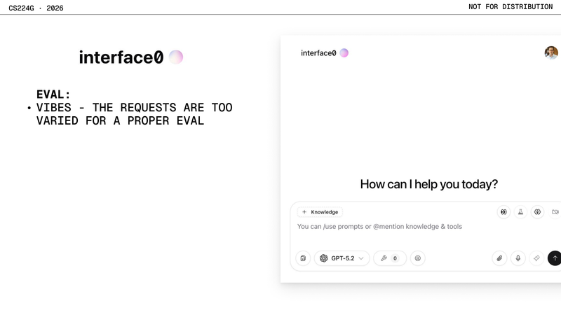 interface0 is an AI interface for power users and teams. Because user requests are so varied (and it is sub-scale), proper evals aren’t feasible here – it’s pure vibe evals.