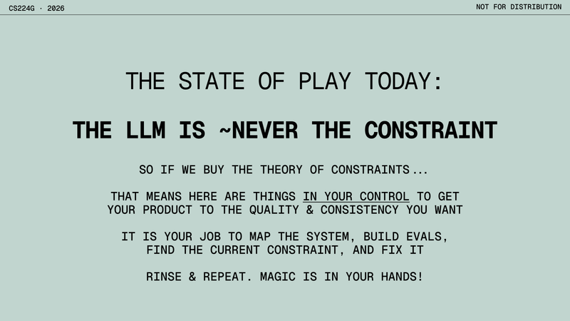 The state of play today: the LLM is ~never the constraint. The frontier models are good enough to do just about anything. If we buy the Theory of Constraints and the idea there is a constraint in the first place bottlenecking quality, that means there are things in your control to get your product to the quality and consistency you want.