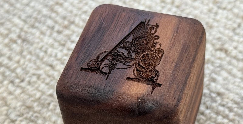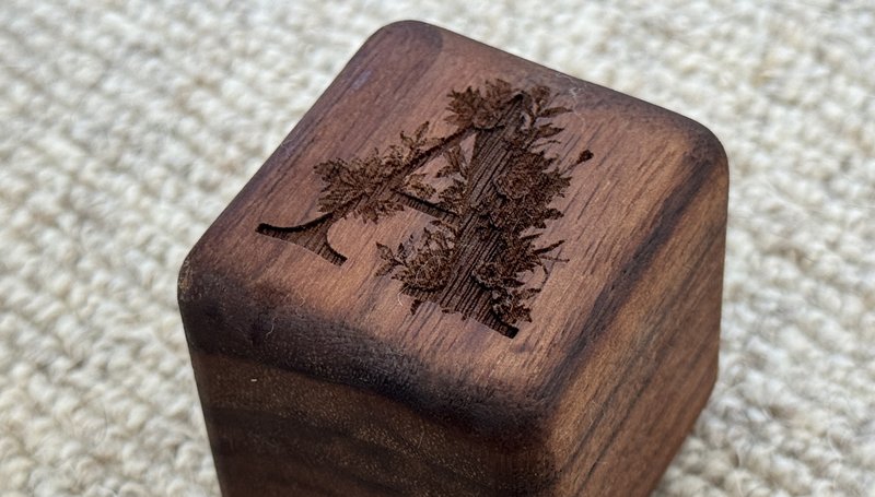 Aside from the wenge pucks above (RIP), the first thing I wanted to make were some simple stacking cubes. Here’s how the very first one came outNote that etching this detailed is likely to make little pieces that might come off when subjected to a child gnawing on it. For production runs I’ll likely do coarser and shallower prints with less risk there. :